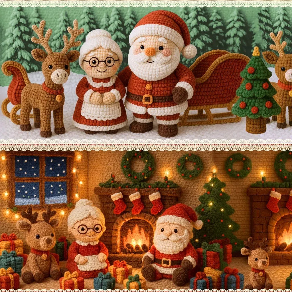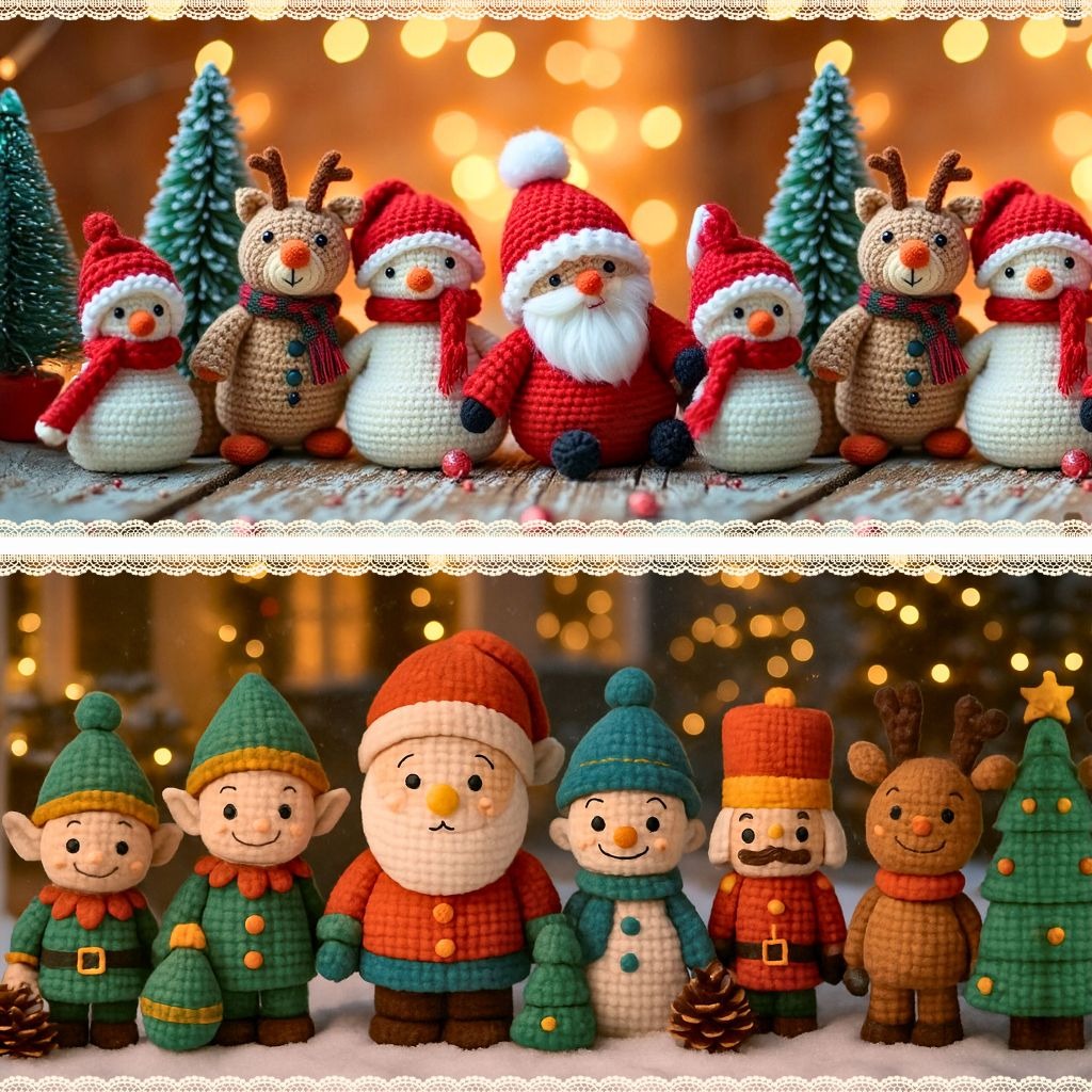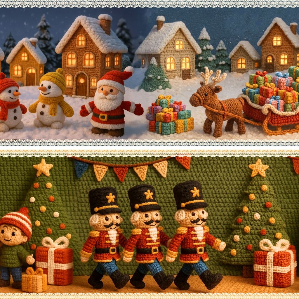 🧶 Inspiração visual: estilo amigurumi, com elementos como renas, soldadinhos de chumbo e presentes
